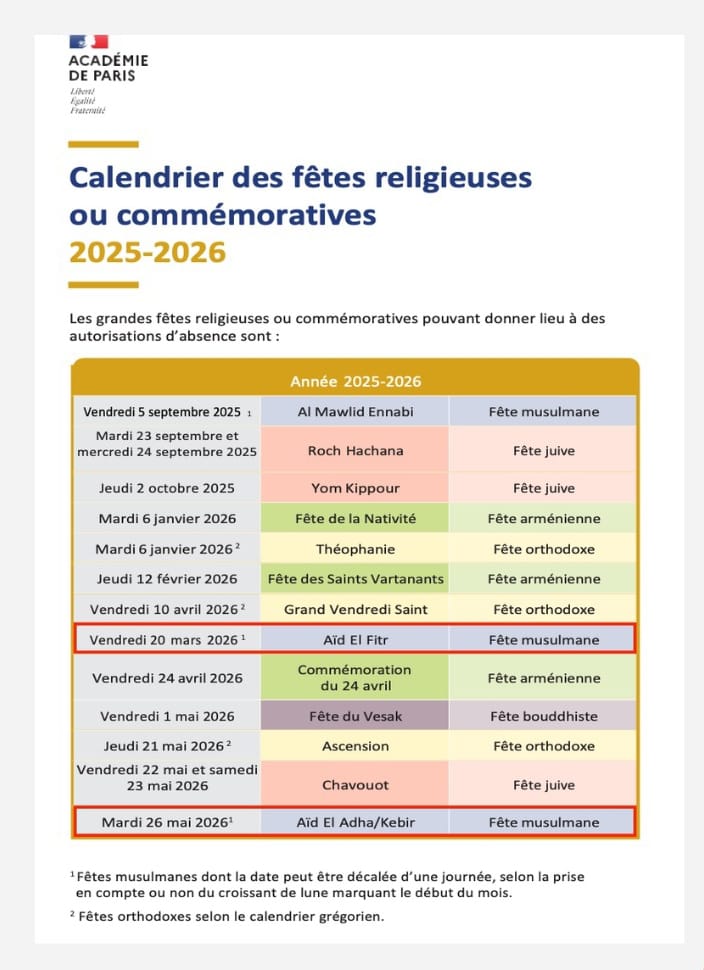 Voici les fêtes religieuses autorisées en France pour l'année 2026 : Fêtes chrétiennes Épiphanie : 4 janvier 2026 Chandeleur :...